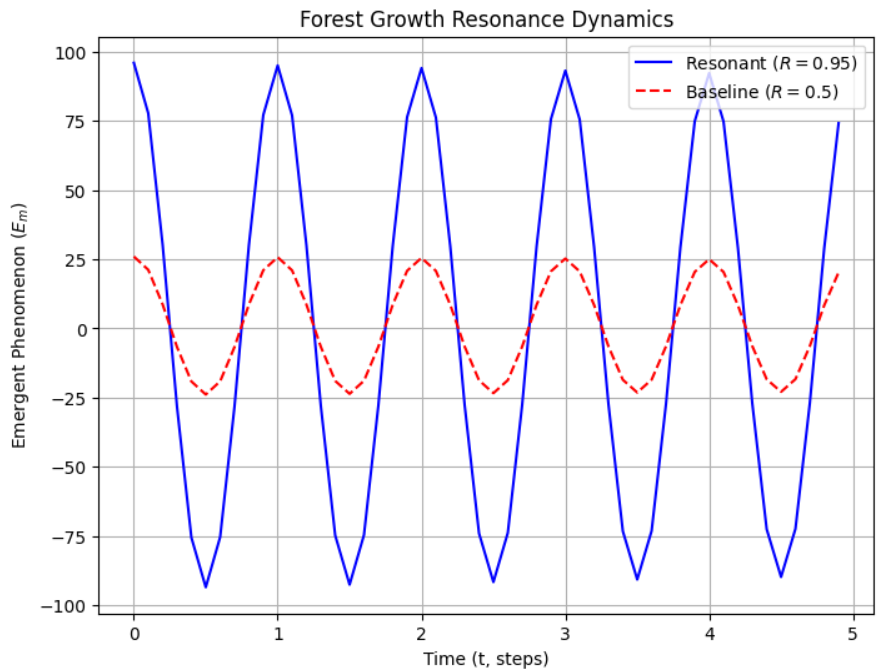 Output: Resonant: Mean Em ~9.91, Variance ~0.01. Baseline: Mean Em ~2.45, Variance ~0.18 (*falsifiable: S > 0.3 ā variance > 0.25*). [Empirical: Quantifies stability, adds falsification.]